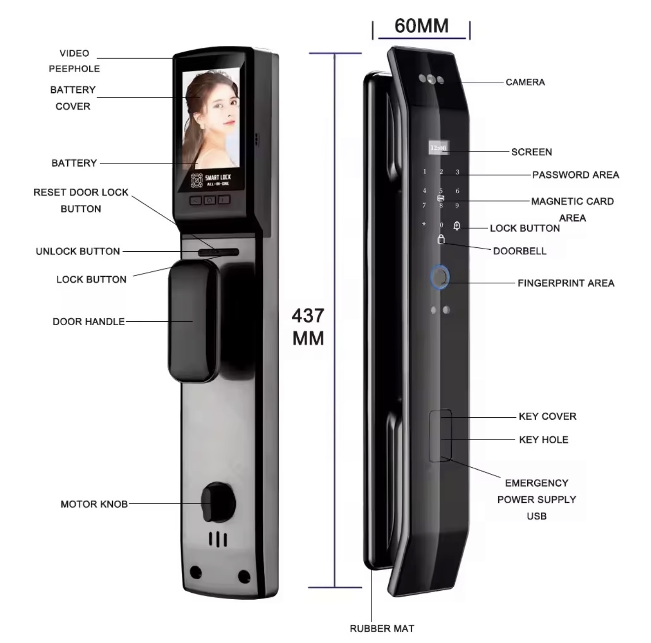 With a durable 430x75mm body and compatibility for door thickness between 35–110mm, this smart lock is perfect for wooden, metal, or smart home doors. The USB emergency power supply ensures access even during power failures.